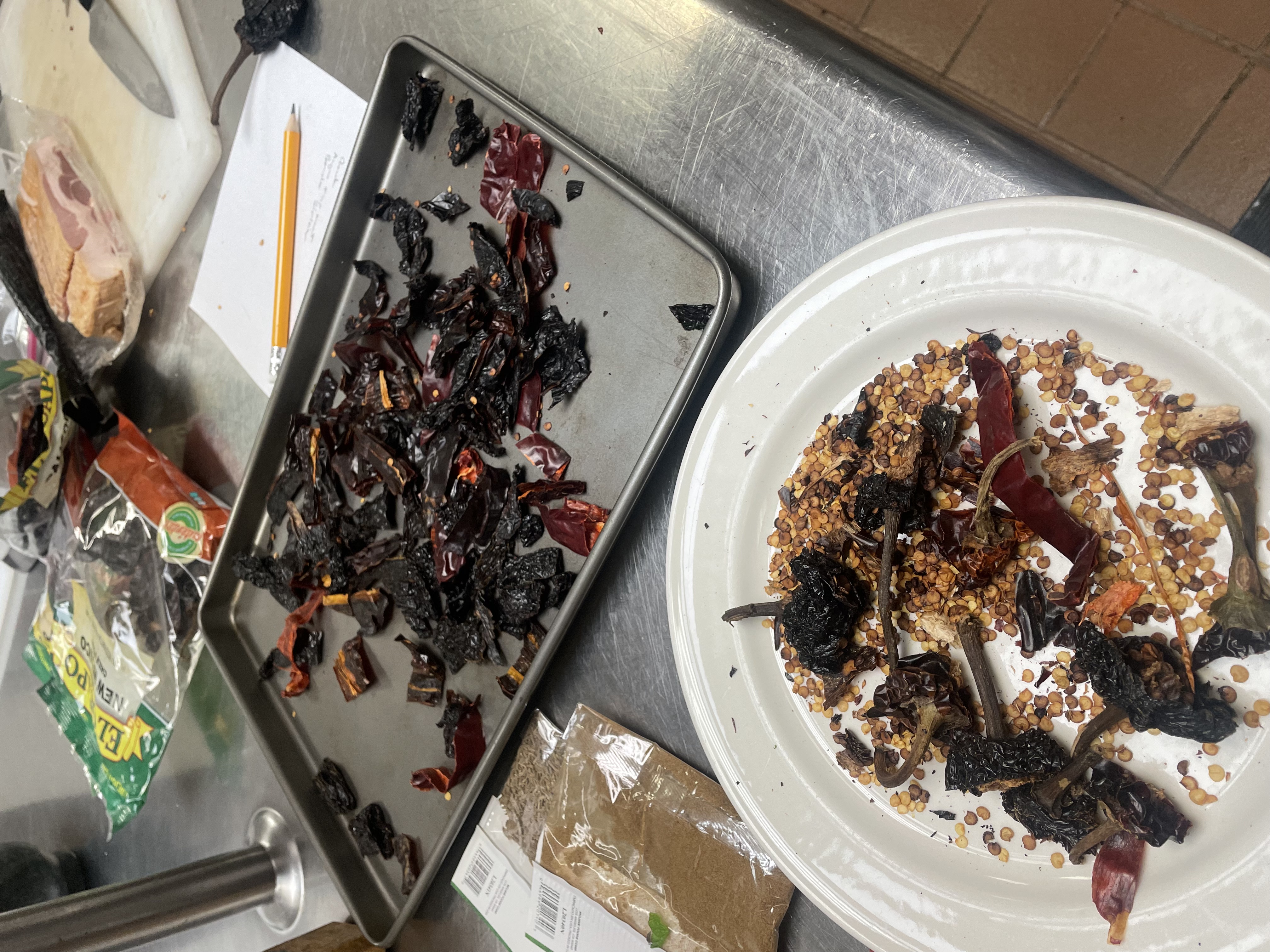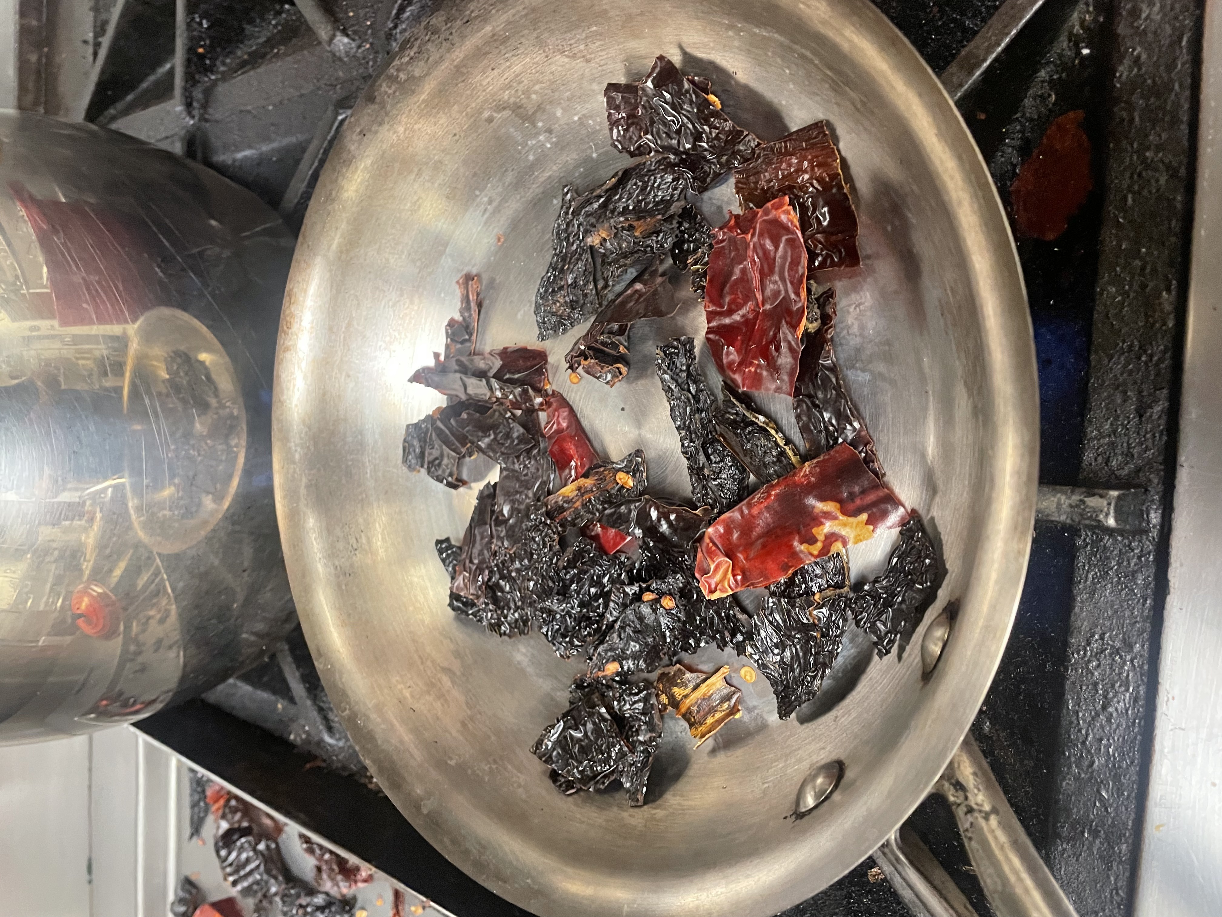 Warm the Chili Pods until they are fragrant, then let them steep in the warm Chicken Stock a while