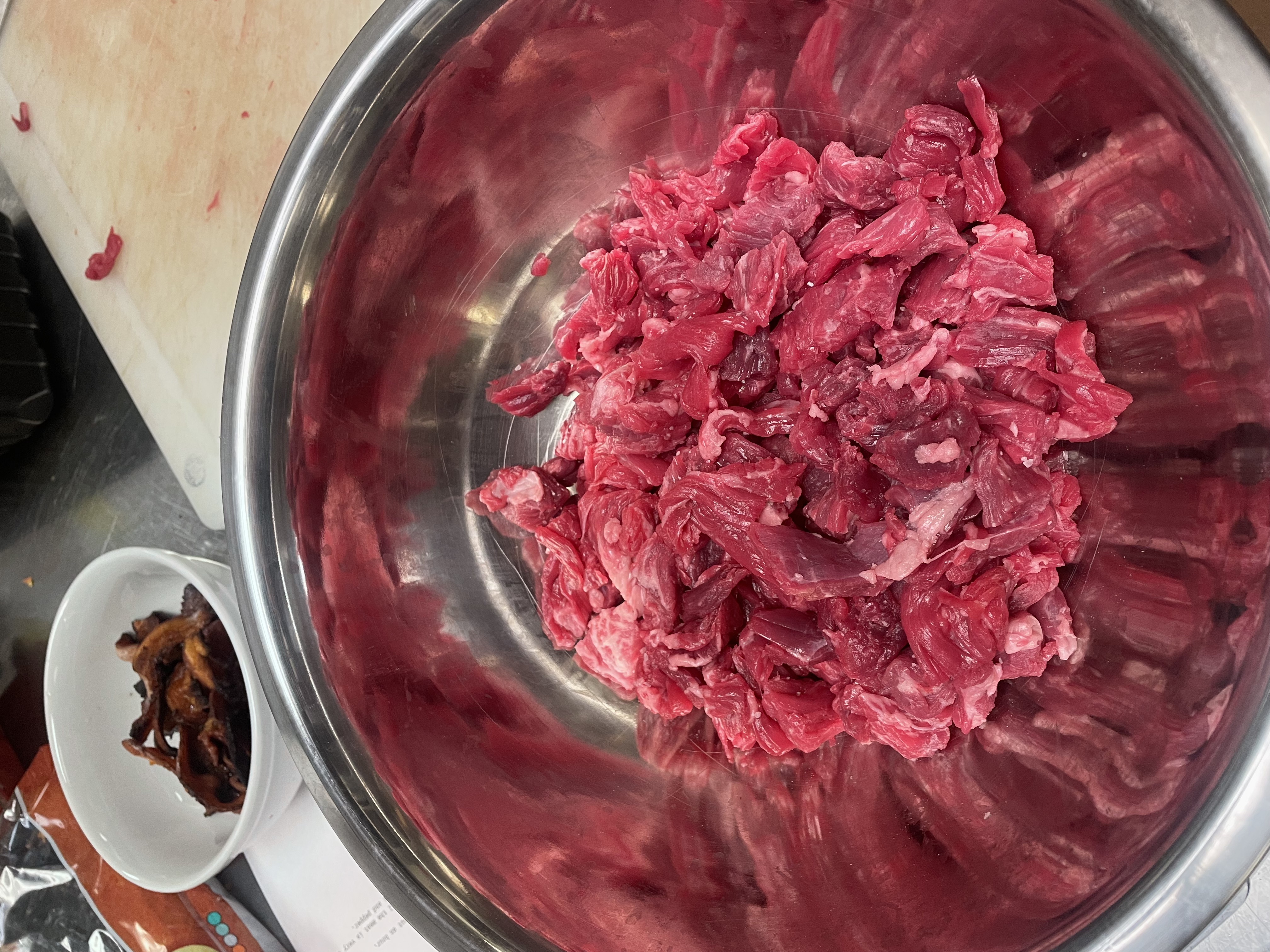 Cube the Beef into one inch pieces (Sirloin Flap Steak, and Chuck are good choices). Use Salt and Baking Soda to Brown the Meat better. (Yes that is the bacon in the upper left of the frame -- I dare you to add it to the chili rather than eat it directly!)