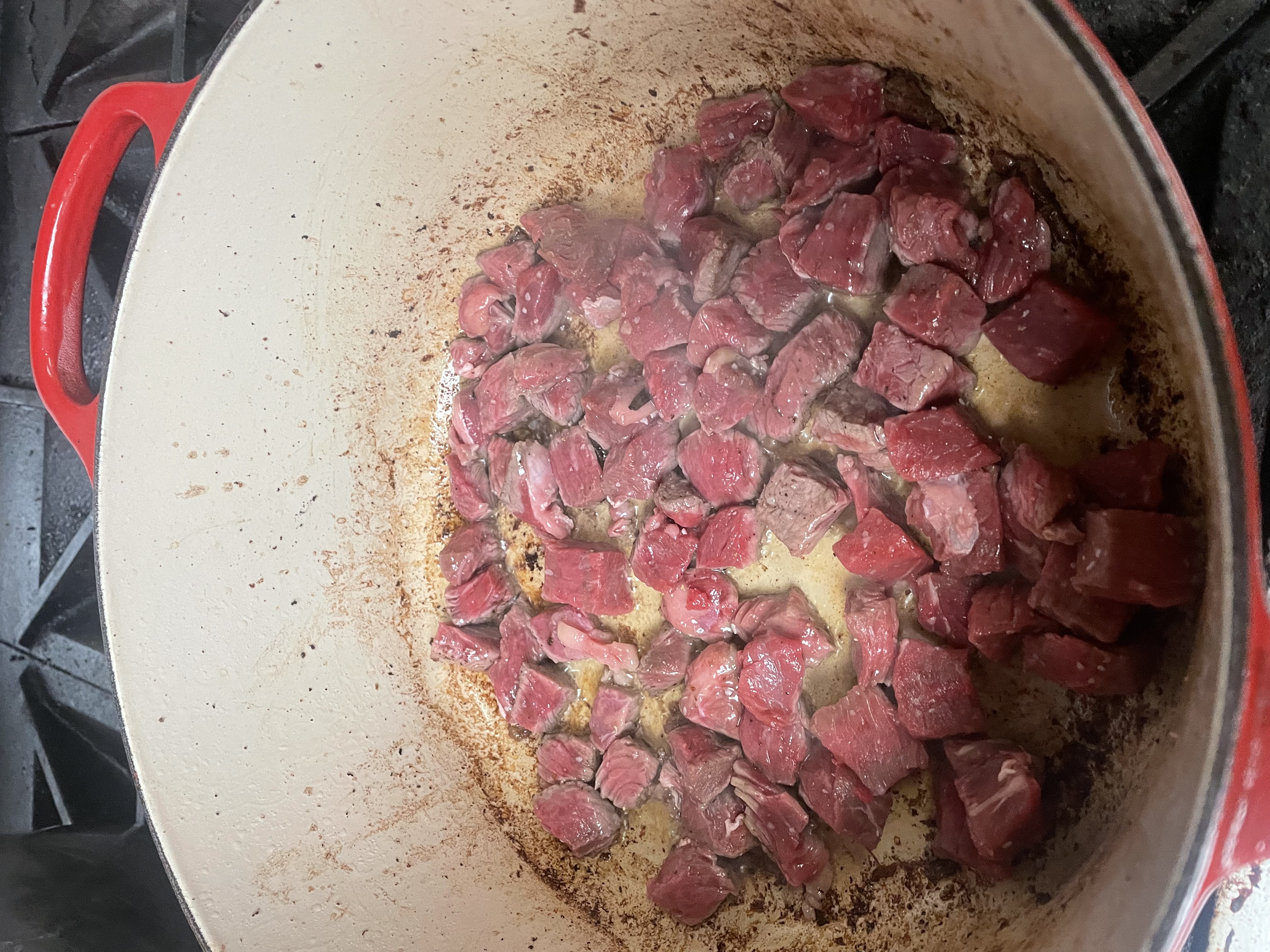 Sear the Beef in the Bacon greese. Remove the meat, start deglazing the pot but cooking the Onions, melting 6 cloves of garlic (just until fragrant), and then finally som broth.